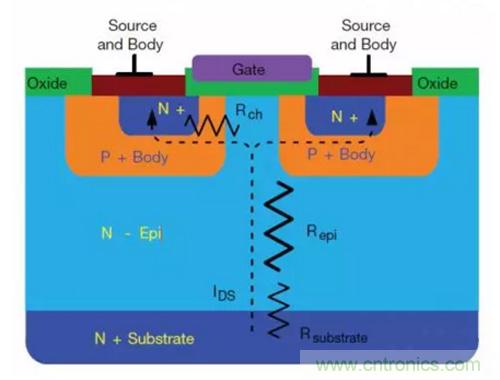 圖1顯示了一種傳統(tǒng)平面式高壓MOSFET的簡(jiǎn)單結(jié)構(gòu)。平面式MOSFET通常具有高單位芯片面積漏源導(dǎo)通電阻,并伴隨相對(duì)更高的漏源電阻。使用高單元密度和大管芯尺寸可實(shí)現(xiàn)較低的RDS(on)值。但大單元密度和管芯尺寸還伴隨高柵極和輸出電荷,這會(huì)增加開關(guān)損耗和成本。另外還存在對(duì)于總硅片電阻能夠達(dá)到多低的限制。器件的總RDS(on)可表示為通道、epi和襯底三個(gè)分量之和: