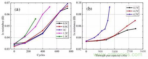 對(duì)電池的動(dòng)態(tài)內(nèi)阻分析如下圖所示,從圖a測(cè)試結(jié)果來看,當(dāng)充電電流小于1C時(shí),電池動(dòng)態(tài)內(nèi)阻隨著電池循環(huán)的變化趨勢(shì)幾乎時(shí)一樣的,但是當(dāng)充電電流超過1C時(shí),電池動(dòng)態(tài)內(nèi)阻增加速度會(huì)隨著充電速率的增加而快速增加。從圖b的測(cè)試結(jié)果來看,當(dāng)充電截止電壓為4.3V時(shí),電池動(dòng)態(tài)內(nèi)阻增加非常迅速表明高截止電壓會(huì)惡化電池的動(dòng)力學(xué)條件,截止電壓為4.1V和4.2V時(shí)電池動(dòng)態(tài)內(nèi)阻增加較為緩慢。