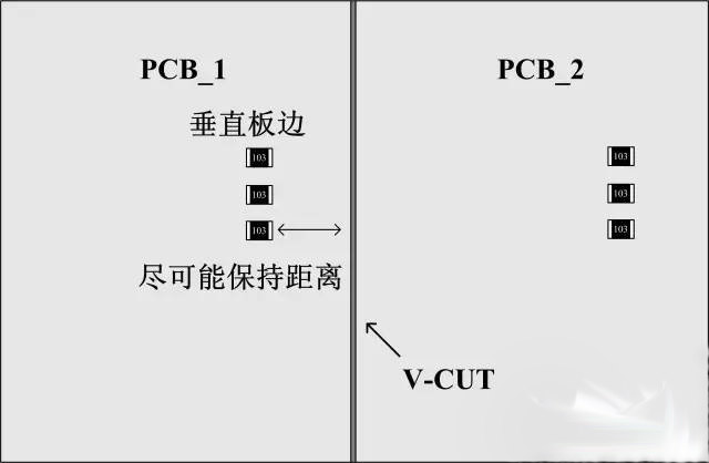 貼片電阻的另外一種常見的損壞是機械損傷后呈開路狀態(tài),后續(xù)導(dǎo)致電路異常(器件外觀有可能正常)。下面是幾個小建議:1、如果是手折板的話(極少使用,無法機器分析,毛刺大),貼片電阻長度方向平行于PCB板邊,零件受的應(yīng)力?。蝗绻荲-CUT的話,貼片器件長度方向垂直于PCB邊,零件破裂可能性較小。2、元件如果與連接處垂直,到連接處的距離建議要≥4mm,若平行,距離建議要≥1.5mm.3、在成本允許的情況下,適當(dāng)加厚PCB板厚度,特別是面積比較大的板子。(下面是兩個簡單的示意圖,實際情況請實際分。)