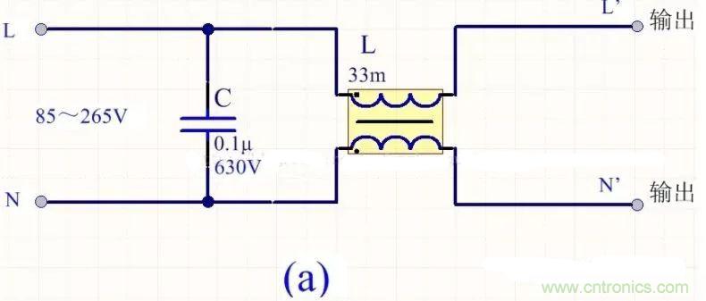 為降低成本和減小體積,開(kāi)關(guān)電源一般采用簡(jiǎn)易的EMI濾波器,主要包括共模扼流圈L和濾波電容,以下四種可以根據(jù)情況進(jìn)行選擇: