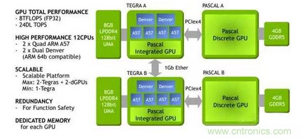 NVIDIA推出的Drive PX2被黃仁勛稱為“為汽車設計的超級電腦”,它將成為汽車的標準配備,可以用來感知汽車所處位置、辨識汽車周遭的物體,并且即時計算最安全的路徑。“Tegra X1處理器和10GB內(nèi)存,能夠同時處理12個200萬像素攝像頭每秒60幀的拍攝圖像,并通過環(huán)境視覺計算技術(shù)和強大的深層神經(jīng)網(wǎng)絡,主動識別道路上的各種車輛,甚至還能檢測前方車輛是否在開門。Driver PX2還搭載了其他合作伙伴的芯片,包括Avago的PEX8724(24-lane,6-port,第三代 PCIe Gen交換機)用于兩塊Parker之間的互聯(lián)。還有一片英特爾收購的Altera提供的FPGA,用于執(zhí)行實時操作系統(tǒng)。FPGA的型號為Cyclone V 5SCXC6,是Altera的頂級產(chǎn)品,邏輯運算為110K,注冊器達166036。最后還有一款英飛凌的AURIX TC 297 MCU做安全控制,據(jù)說可以讓PX2達到ASIL C級水平。 還有博通的BCM89811低功耗物理層收發(fā)器(PHY),使用BroadR-Reach車載以太網(wǎng)技術(shù),在單對非屏蔽雙絞線上的傳輸速率可達100Mbps。所以NVidia實際上推出了板級的ADAS系統(tǒng)。