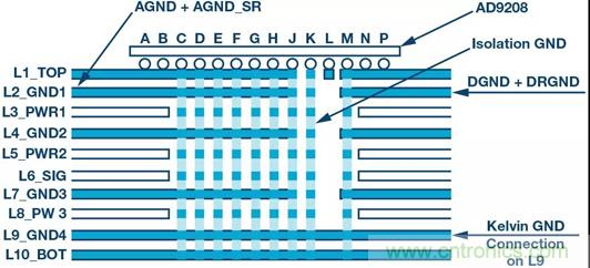通過充分濾波和布局分離,各個域可以合理布置,使得ADC性能最大化,同時降低BOM和PDN復雜性。各接地域采用開爾文連接方法也會改善隔離。從網(wǎng)表角度來看,仍然只有一個GND網(wǎng)。電路板可以劃分為不同接地域以提供充分的隔離。在AD9208的評估板AD9208-3000EBZ中,不同接地分區(qū)在第9層上形成開爾文連接。圖4所示為10層PCB(印刷電路板)AD9208-3000EBZ的橫截面,其顯示了不同GND連接。