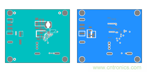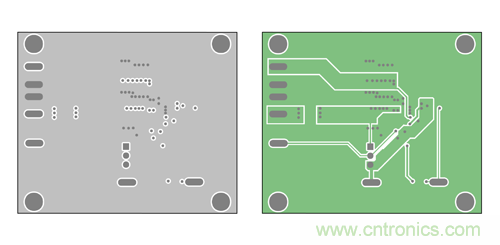 現(xiàn)在,我們以 Maxim 的喜馬拉雅 MAX17502 寬輸入范圍 IC 為例,器件工作在 4.5-60Vin、0.9- 54Vout,提供 1A 負載電流。以下為 MAX17502 EMI 評估板 PCB 的布局,采用了法拉第屏蔽技術(shù) (b)。圖 11a 所示為頂層和底層,用作法拉第屏蔽;圖 11b 所示為內(nèi)部第二層和第三層,用于布線。這里的第二層用作額外屏蔽,也可用于布線。該布局中,高 di/dt 電流環(huán)路 I1 和 I2 布置在第三層, 被完整籠罩在法拉第屏蔽中。