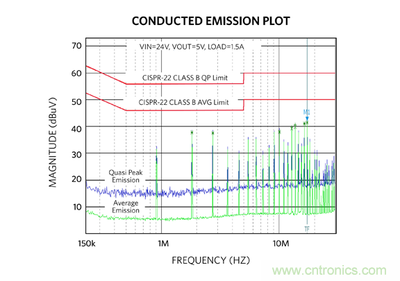 圖 15:MAXM17575 評估板傳導 EMI 測試結(jié)果。藍色:準峰值;綠色:平均值