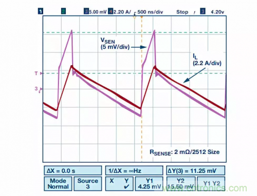 檢測電阻也可以放在底部MOSFET的低端,如圖7所示。此處監(jiān)測峰值開關(guān)電流(也是峰值電感電流),每半個周期產(chǎn)生一個電流波形。MOSFET開關(guān)切換導致電流信號具有很強的開關(guān)噪聲。