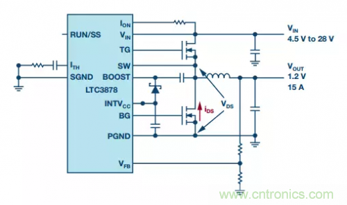 利用MOSFET RDS(ON)進行電流檢測,可以實現(xiàn)簡單且經(jīng)濟高效的電流檢測。LTC3878是一款采用這種方法的器件。它使用恒定導通時間谷值模式電流檢測架構(gòu)。頂部開關(guān)導通固定的時間,此后底部開關(guān)導通,其RDS壓降用于檢測電流谷值或電流下限。