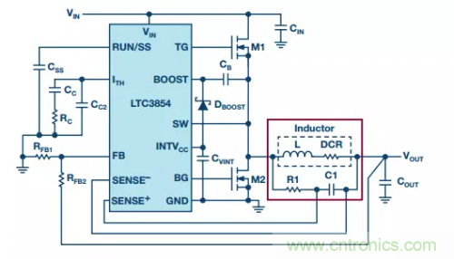 使用RSENSE和DCR兩種檢測方法時,由于檢測信號較小,故均需要開爾文檢測。必須讓開爾文檢測痕跡(圖5中的SENSE+和 SENSE-)遠離高噪聲覆銅區(qū)和其他信號痕跡,以將噪聲提取降至最低,這點很重要。某些器件(如LTC3855)具有溫度補償DCR檢測功能,可提高整個溫度范圍內(nèi)的精度。