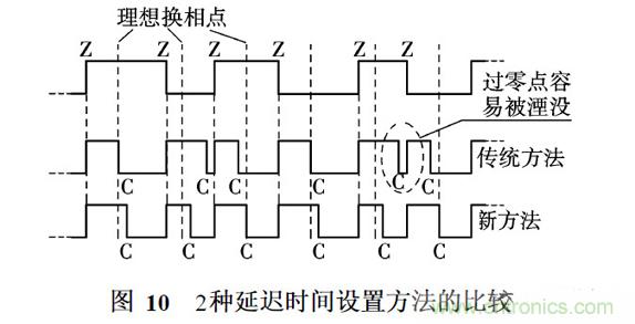 采用傳統(tǒng)的延遲時間設置方法,某些換相點偏離理想換相點較大. 當某次換相嚴重滯后時,下次過零點容易被湮沒,導致電機失步,如圖10所示.