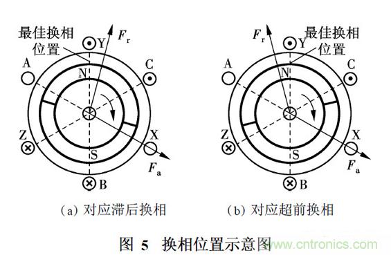 最佳換相邏輯是指繞組在梯形波反電勢的平頂部分導通, 與之對應的最佳換相位置是指在換相完成后,定子磁勢超前轉子磁勢120°電角度,如圖5所示. 其中, Fa 和Fr 分別表示定子磁勢和轉子磁勢. 在一個工作狀態(tài)內定子磁勢平均超前轉子磁勢90°電角度,平均電磁轉矩最大.