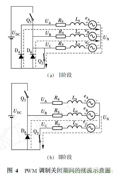 AC 和AB 區(qū)為A 相上橋臂開關PWM 調制階段. 以AC區(qū)為例,在PWM 開通期間, Q1 和Q2 導通, A 相繞組與直流側電壓的正極相連, 端電壓為UDC ;在PWM 關閉期間, Q1 關閉, Q2 導通,由于繞組阻抗呈感性, A 相下橋臂的反并聯(lián)二極管D4 導通續(xù)流,此時A 相繞組與直流側電壓的負極相連,端電壓為零.