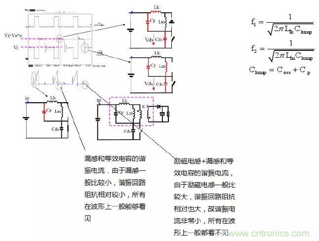 f1比f2大很多(從波形上可以看出),這是由于漏感一般相對較小;同時(shí)由于f1所在回路阻抗比較小,諧振電流較大,所以能夠很快消耗在等效電阻上,這也就是為什么f1所在回路很快就諧振結(jié)束的原因?。ň唧w諧振時(shí)間可以通過等效模型求解:二次微分方程估算)