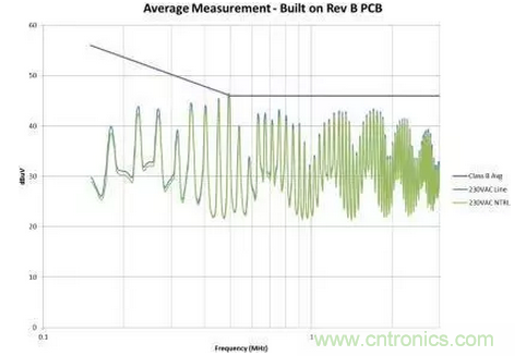 圖4是修改后的效果圖。我們?cè)诠收宵c(diǎn)位置為EMI規(guī)范獲得了大約6dB的裕量。此外,我們還顯著減少了總體EMI簽名。所有這些改善都僅僅是因?yàn)椴季值恼{(diào)整,并未改變電路。如果您的電路具有高電壓開關(guān)并使用了屏蔽距離,您需要非常小心地對(duì)其進(jìn)行控制。