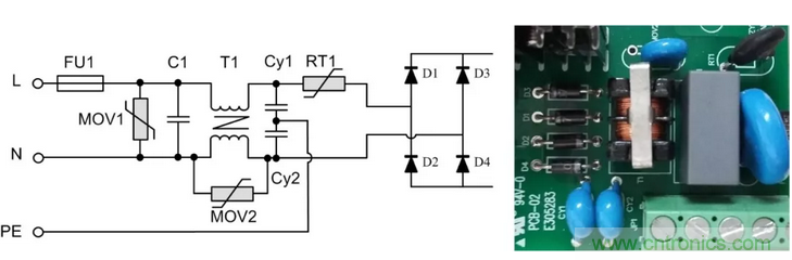 背景:以某型號(hào)的電源模塊為例,該模塊是ZLG致遠(yuǎn)電子為某客戶定制的電源模塊,輸入85VAC~350VAC,且EMC前級(jí)電路電路嵌入到模塊中??估擞恳蟛钅k妷?KV,共模電壓6KV。更換更大的保險(xiǎn)絲后可承受6KV差模電壓。其前級(jí)原理圖及對(duì)應(yīng)實(shí)物圖如圖2所示。