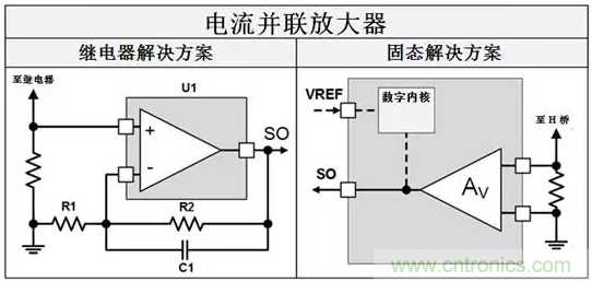 繼電器解決方案需要單獨(dú)的分立放大器電路來增加在檢測電阻上測量的電壓。