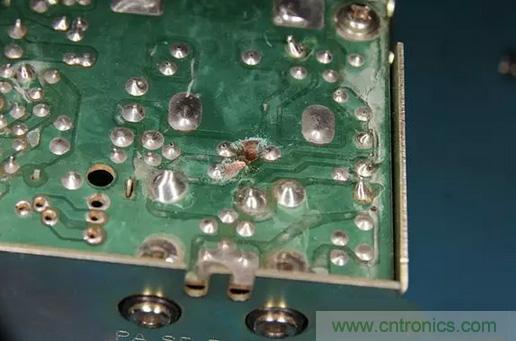 大部分情況下,除了電路板上被炸出的銅走線,反向極性二極管也會(huì)短路,必須更換。但這次,我們很走運(yùn),二極管性能良好。所以,現(xiàn)在我們必須修復(fù)這個(gè)開(kāi)路走線。