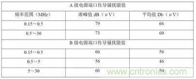 開(kāi)關(guān)電源的傳導(dǎo)騷擾是通過(guò)電源的輸入電源線向外傳播的電磁干擾。在開(kāi)關(guān)電源輸入電源線中向外傳播的騷擾,既有差模騷擾、又有共模騷擾,共模騷擾比差模騷擾產(chǎn)生更強(qiáng)的輻射騷擾。傳導(dǎo)騷擾的測(cè)試頻率范圍為150KHz~30MHz,限值要求如下表1 所示: