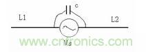 圖中,Vs 為騷擾源,對(duì)圖4 來(lái)說(shuō),就是開(kāi)關(guān)管VT2 的D 極,L1、L2 相當(dāng)于天線的兩個(gè)極,一個(gè)極是與開(kāi)關(guān)管D 極相連的印制線,另外一個(gè)極是散熱器及與之相連的接地線,C是天線兩極之間的耦合電容,即圖4 中開(kāi)關(guān)管與散熱器之間的耦合電容。