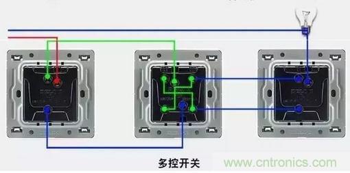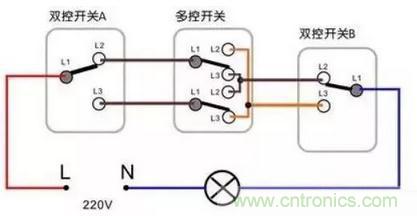這樣的線路在電梯中常用,當然有時臥室改的細致一點,床左右都加上開關,門口再一個,也是單聯(lián)三控線路了。