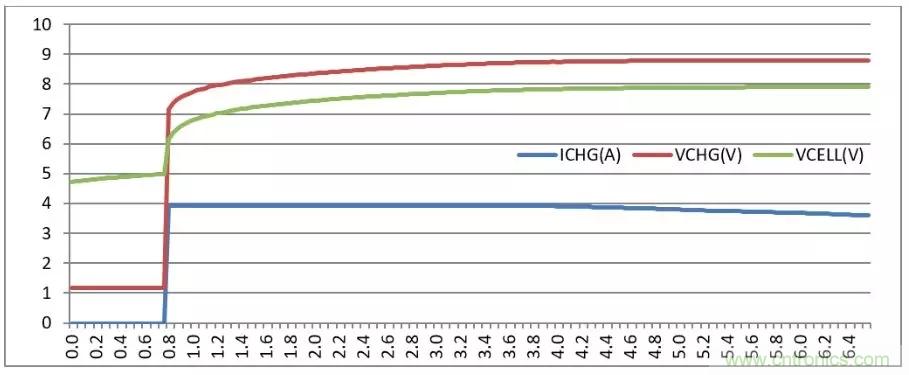 通過引入電量計芯片配合充電芯片的控制,可以彌補VCHG到VCELL的電壓差。電量計芯片除了提供電量功能,還采集了電池的電芯電壓參數(shù),通過實時訪問電量計芯片中的電芯電壓VCELL采樣結(jié)果,根據(jù)VCELL電壓是否達到最大滿充電壓來決定是否提高充電芯片的VCHG,維持電池的CC充電狀態(tài)。直到VCELL達到最大滿充電壓8.8V進入CV區(qū)間,停止提高VCHG,并根據(jù)VCELL的繼續(xù)升高趨勢而調(diào)低VCHG,維持VCELL在8.8V的最大電壓,保護電池。通過讀取VCELL電壓配合變化的VCHG可以達到快速智能的充電管理過程。