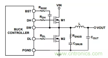 在DH或DL引腳上串聯(lián)一個(gè)小電阻(約2 Ω至4 Ω)可以減慢柵極驅(qū)動(dòng),從而也能降低柵極噪聲和過沖。另外,BST與SW 引腳之間也可以連接一個(gè)電阻(參見圖6)。在布局期間用0 Ω柵極電阻保留空間,可以提高日后進(jìn)行評(píng)估的靈活性。增加的柵極電阻會(huì)延長柵極電荷上升和下降時(shí)間,導(dǎo)致 MOSFET的開關(guān)功率損耗提高。