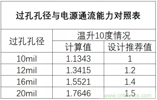換層時孔的大小及數(shù)目是否滿足電源電流通流能力。首先要了解單個過孔的通流能力,在常規(guī)情況下,溫升為10度,可參考下表。