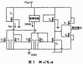IDDQ測試是對功能測試的補充。通過測試靜態(tài)電流IDDQ可檢測出電路中的物理缺陷所引發(fā)的故障。IDDQ測試還可以檢測出那些尚未引起邏輯錯誤,但在電路初期會轉(zhuǎn)換成邏輯錯誤的缺陷。本文所設(shè)計的IDOQ電流測試電路對CMOS被測電路進行檢測,通過觀察測試電路輸出的高低電平可知被測電路是否有物理缺陷。測試電路的核心是電流差分放大電路,其輸出一個與被測電路IDDQ電流成正比的輸出。測試電路串聯(lián)在被測電路與地之間,以檢測異常的IDDQ電流。