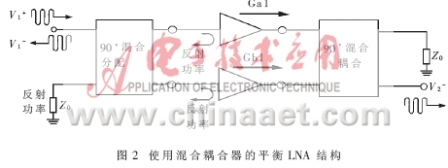 通常,在LNA的設(shè)計(jì)中主要考慮低噪聲系數(shù)(NF)。足夠的增益(G)和絕對的穩(wěn)定性?對于本文TMA放大器中LNA設(shè)計(jì)的實(shí)際技術(shù)規(guī)范要求如表1所示。同時(shí)要求所使用的LNA結(jié)構(gòu)滿足良好的輸入輸出匹配,保證LNA的穩(wěn)定性,兼顧到功分/合路網(wǎng)絡(luò)的低損耗、幾何尺寸小,工作帶寬內(nèi)良好的相位和幅度匹配,足夠的工作帶寬(涵蓋在1.95GHz左右),符合CDMA標(biāo)準(zhǔn)上行頻率?據(jù)此選擇了以平衡結(jié)構(gòu)為特征的LNA結(jié)構(gòu)(如圖2)。這種平衡結(jié)構(gòu)的重要特性是:它較單階放大器的截點(diǎn)高出一倍,并以標(biāo)準(zhǔn)50Ω實(shí)現(xiàn)輸入輸出匹配,在某一路硬件失效時(shí)電路的冗余設(shè)計(jì)可保證系統(tǒng)的正常運(yùn)行。但通常增益減少6dB。