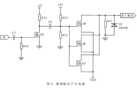 弱脈沖放大電路的輸出脈沖通過控制MOS管的通斷控制電容的充放電,從而形成符合要求的調(diào)制脈沖,驅(qū)動(dòng)振蕩器工作。調(diào)制脈沖產(chǎn)生電路如圖4所示。