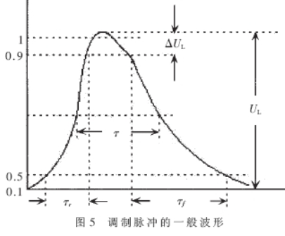 在理想情況下,脈沖調(diào)制器輸出的脈沖應(yīng)為矩形,矩形脈沖頂部平坦,脈沖持續(xù)期間雪崩管振蕩器的功率和頻率穩(wěn)定。但實(shí)際上,由于脈沖調(diào)制器中不可避免地存在有寄生參量,例如分布電容、引線電感等,而其上的電壓、電流又是不能突變的,這就使得脈沖調(diào)制器不可能輸出理想的矩形調(diào)制脈沖,一般脈沖波形如圖5所示。