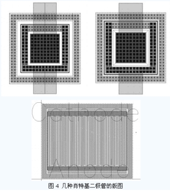 圖4 所示是在UMC 0.18um CMOS 工藝下設(shè)計(jì)的幾種肖特基二極管的版圖。它們的直流特性測(cè)試曲線(xiàn)如圖5 所示。從直流特性的測(cè)試結(jié)果