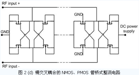在這些電源恢復(fù)電路中,并不存在最理想的電路結(jié)構(gòu),每種電路都有各自的優(yōu)點(diǎn)及缺陷。在不同的負(fù)載情況、不同的輸入電壓情況、不同的輸出電壓要求以及可用的工藝條件下,需要選擇不同的電路以使其達(dá)到最優(yōu)的性能。圖2(a)所示的多級(jí)二極管倍壓電路,一般采用肖特基勢(shì)壘二極管。它具有倍壓效率高、輸入信號(hào)幅度小的優(yōu)點(diǎn),應(yīng)用十分廣泛。但是,一般代工廠(chǎng)的普通CMOS 工藝不提供肖特基勢(shì)壘二極管,在工藝的選擇上會(huì)給設(shè)計(jì)者帶來(lái)麻煩。圖2(b)是用接成二極管形式的PMOS 管來(lái)代替肖特基二極管,避免了工藝上的特殊要求。這種結(jié)構(gòu)的倍壓電路需要有較高的輸入信號(hào)幅度,在輸出電壓較高時(shí)具有較好倍壓效率。圖2(c)是傳統(tǒng)的二極管全波整流電路。與Dickson 倍壓電路相比,倍壓效果更好,但引入了更多的二極管元件,功率轉(zhuǎn)換效率一般略低于Dickson 倍壓電路。另外,由于它的天線(xiàn)輸入端與芯片地分離,從天線(xiàn)輸入端向芯片看去,是一個(gè)電容隔直的全對(duì)稱(chēng)結(jié)構(gòu),避免了芯片地與天線(xiàn)的相互影響,適合于與對(duì)稱(chēng)天線(xiàn)(例如偶極子天線(xiàn))相接。圖2(d)是許多文獻(xiàn)提出的全波整流電路的CMOS 管解決方案。在工藝受限的情況下,可以獲得較好的功率轉(zhuǎn)換效率,并且對(duì)輸入信號(hào)幅度的要求也相對(duì)較低。