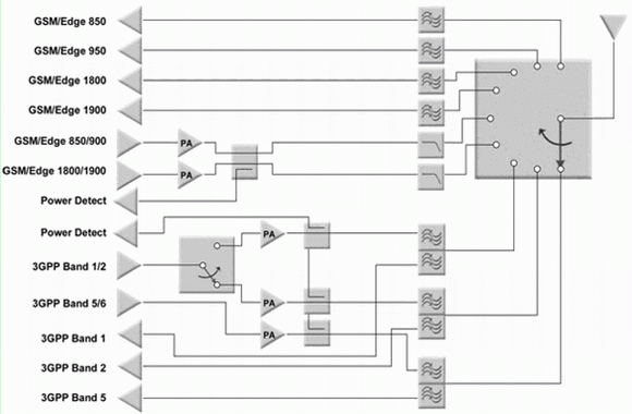 隨著多頻段架構(gòu)的普及,對(duì)功放和相關(guān)濾波器的數(shù)量提出了嚴(yán)格的要求。事實(shí)上,對(duì)功放的技術(shù)要求沒(méi)有變化,但手機(jī)設(shè)計(jì)需要使用更多的功放。因此真正改變的是需要一個(gè)特別高效的方法將所有射頻信號(hào)傳送給天線-單片開關(guān)。
