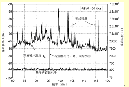 由現(xiàn)場測試可知,在接收FM調(diào)頻信號時,ActivvTM有源天線的性能相當于耳機連接線型天線,雖然這兩種天線的尺寸有很大差別。考慮到有源天線的體積小,它的幅射電阻大約只有1mΩ,而寄生損失電阻至少有1Ω左右,增益在-30~-50dBi的范圍內(nèi)。對于大多數(shù)RF工程師來講,這樣的增益是很難接受的。但是有一個因素極大地放寬了接收FM調(diào)頻信號時對增益的要求,即很高的環(huán)境噪聲溫度。圖8是一個消聲室(為了得到保守的估計)在屏蔽裝置拿走后的噪聲電平。大多數(shù)無線系統(tǒng)工作在頻率高于1GHz的范圍,環(huán)境噪聲接近室溫,增益為-10dBi,相當于信噪比降低了10dB,在FM頻段內(nèi),在城市的大部分地區(qū),由于人為噪聲的影響,噪聲電平高了大約20dB(對于調(diào)幅會更高)。因此,與完美的雙極電線相比,效率差的天線收到的信號較弱,噪聲較小。圖9給出了增益不同(0、-20、-40dB)的三種天線不同噪聲溫度時的G/T值。所有三種天線都接到噪聲指數(shù)為6dB的接收器上。對于增益為-40dB的實際天線(在室溫下G/T值減少46dB),當情況相同時,在23.000K的典型溫度下性能提高了19dB。對于有源天線,通過壓制接收器的噪聲指數(shù),可以把性能再提高6dB。所以,從信噪比方面看,增益為 -40dB的無源天線,只比完美的雙極天線差27dB。