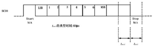 此時約過3ms,SCIO開始輸出數(shù)據(jù),第一個Byte即為STARTByte,總共輸出14Bytes數(shù)據(jù)。見圖6.