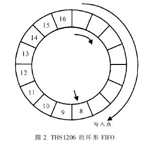 THS1206內(nèi)部的FIFO安排成環(huán)形,采用讀取點(diǎn)、寫入點(diǎn)和觸發(fā)點(diǎn)控制讀寫操作,如圖2所示。芯片的轉(zhuǎn)換時(shí)鐘CONV_CLK控制采樣保持和A/D變換,CONV_CLK讓四個(gè)通道的信號(hào)同時(shí)采樣保持,然后分別轉(zhuǎn)換為數(shù)字信號(hào)并自動(dòng)順序?qū)懭隖IFO,同時(shí)FIFO的寫入點(diǎn)向前移動(dòng),指示下一個(gè)寫入點(diǎn);當(dāng)FIFO內(nèi)的數(shù)據(jù)達(dá)到預(yù)定的觸發(fā)深度時(shí),發(fā)出數(shù)據(jù)就緒信號(hào)DATSA_AV發(fā)出,DSP讀取轉(zhuǎn)換數(shù)據(jù),同時(shí)清除DATA_AV信號(hào),讀取點(diǎn)和觸發(fā)點(diǎn)向前移動(dòng)。芯片的工作方式由兩個(gè)寄存器控制,通過(guò)寫寄存器,可以選擇使用通道、工作模式、FIFO觸發(fā)深度、DATA_AV的極性與觸發(fā)方式等。