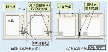 圖5a是在接觸式智能卡芯片的發(fā)展過程中曾大量采用的測試態(tài)控制方式:使用額外的I/O管腳和芯片內(nèi)部電路相連,該連線通過劃片槽,這樣芯片劃斷后就不能通過簡單控制該管腳進入測試態(tài)。由于FIB修補技術(shù)的出現(xiàn),這個手段已經(jīng)過時。圖5b是最有潛力的替代方案:在劃片槽和鄰近的芯片中設(shè)計部分控制電路,從而得到不可逆的測試態(tài)控制手段。