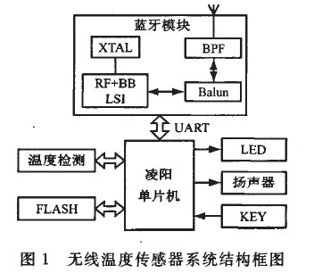 無線溫度傳感器主要由單片機(jī)控制單元、藍(lán)牙模塊、溫度檢測單元、接口電路及其它輔助電路組成,系統(tǒng)結(jié)構(gòu)如圖1所示。控制單元凌陽單片機(jī)為整個(gè)系統(tǒng)的核心,對(duì)檢測到的溫度數(shù)據(jù)進(jìn)行轉(zhuǎn)換、顯示、傳輸,外擴(kuò)4MBFLASH用于存儲(chǔ)程序和溫度數(shù)據(jù)。藍(lán)牙模塊包括藍(lán)牙芯片、放大器、非平衡變壓器(Balun)等,負(fù)責(zé)與藍(lán)牙控制終端進(jìn)行無線連接和數(shù)據(jù)傳輸,按鍵完成系統(tǒng)設(shè)置、復(fù)位等信息輸人,測量的溫度數(shù)據(jù)在傳輸?shù)娇刂平K端的同時(shí)在LED上顯示,并通過揚(yáng)聲器定時(shí)語音播報(bào)當(dāng)前溫度數(shù)據(jù)和超限報(bào)警。