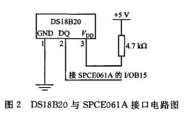 溫度檢測單元采用D1S8B02型傳感器,是美國DALLAS公司推出的一種改進(jìn)型智能溫度傳感器,與傳統(tǒng)的熱敏電阻等測溫元件相比,它能直接讀出被測溫度,并且可根據(jù)實(shí)際要求通過編程實(shí)現(xiàn)9~12位的數(shù)字值讀數(shù)方式。DS18BZo與SPCEo61A單片機(jī)的接口電路如圖2所示,由于DS18B20傳感器支持“一線總線”接口,因此只需將DS18B20信號(hào)線接到單片機(jī)的1位1/0線上即可,而且在1根1/0線上可以掛接多個(gè)傳感器實(shí)現(xiàn)多點(diǎn)溫度測量。