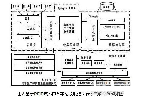 本系統(tǒng)采用B/S架構(gòu),在J2EE開發(fā)環(huán)境下,結(jié)合Struts2、Hibernate、Spring、DWR等主流開源框架,具有良好的跨平臺(tái)兼容性?;赗FID技術(shù)的汽車總裝管理系統(tǒng)的軟件架構(gòu)如圖3所示: