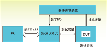 我們的第一個(gè)例子包括測(cè)試儀器、器件傳遞裝置(handler)和PC(圖1),這里需要注意如何通過內(nèi)部編程來(lái)消除大多數(shù)的GPIB通訊來(lái)加速測(cè)試。