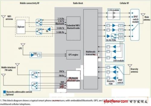 圖1:該模塊圖顯示了典型的智能手機(jī)架構(gòu),除了多頻段蜂窩電話外,還包含嵌入式藍(lán)牙、GPS和調(diào)頻收音機(jī)功能。