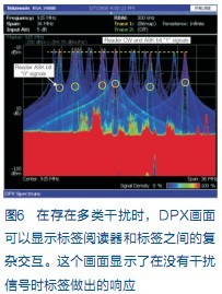 在進(jìn)行頻率規(guī)劃,把每個閱讀器限定在某條通道(或多條通道)時,可以使用DPX保證調(diào)制邊帶的電平不會在并放閱讀器使用的通道中產(chǎn)生干擾。注意圖6中心的閱讀器和標(biāo)簽信號擁有寬頻譜展寬,駐留時間要長于其它通道。較亮的信號邊緣表明信號密度較高,因此駐留時間較長。這可能會導(dǎo)致鄰道讀取失敗,應(yīng)采取措施,保證閱讀器中的濾波功能足以抗擊這種干擾。