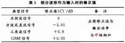 上述情況僅適用于900 MHz~8 GHz的正弦波輸入信號,而通信系統(tǒng)中,還有其他的波形,如果測量其他的波形的功率,則可根據(jù)不同波形的修正C值來進(jìn)行修正,因波形不同修正值也不相同,表1為不同的信號波形的修正值。
