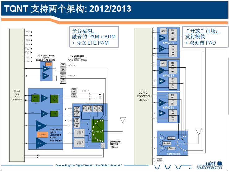對于多頻多模的3G/4G手機(jī),針對射頻前端器件的設(shè)計如何實現(xiàn)集成?熊挺表示,目前有兩種方案:一種是融合架構(gòu),將不同頻率的射頻功率放大器PA集成;另一種架構(gòu)則是沿信號鏈路的集成,即將PA與雙工器集成。兩種方案各有優(yōu)缺點,適用于不同的手機(jī)。融合架構(gòu),PA的集成度高,對于3個以上頻帶巨有明顯的尺寸優(yōu)勢,5-7個頻帶時還巨有明顯的成本優(yōu)勢。缺點是雖然PA集成了,但是雙工器仍是相當(dāng)復(fù)雜,并且PA集成時有開關(guān)損耗,性能會受影響。而對于后一種架構(gòu),性能更好,功放與雙功器集成可以提升電流特性。所以TriQuint可以提供兩種架構(gòu)的方案,大于6個頻段時(指3G和4G)采用融合架構(gòu),而小于四個頻段時采用PA與雙工器集成的方案PAD。