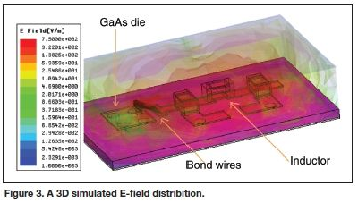 第二個關(guān)注的地方是微帶線附近的場線,在靠近地平面的地方它們最強(qiáng)。只要屏蔽和地平面間的距離明顯大于微帶線和地平面間的距離,則增加的屏蔽的效用就微乎其微。線綁定和表貼電感與地平面的直接耦合要弱些,當(dāng)施加屏蔽時,預(yù)期其場線會有變化。圖3顯示的是3D模擬的E場分布。
