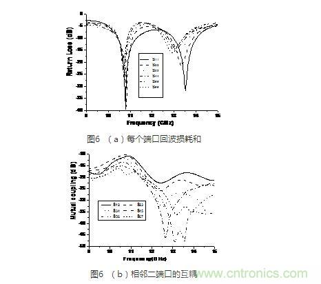 圖6給出了該相控陣前六個(gè)激勵(lì)端口的仿真回波損耗和和前七個(gè)天線的相鄰單元的耦合系數(shù)曲線??梢钥闯觯鱾€(gè)端口匹配良好,且互耦隨著間隔的增大而較小。