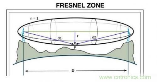 菲涅爾區(qū)是指無(wú)線電波離開(kāi)天線后在可視距離周?chē)鷤鞑サ膮^(qū)域,如圖2所示。擁有視距對(duì)于保持強(qiáng)度有利,對(duì)于2.4GHz無(wú)線系統(tǒng)更是如此,原因在 于2.4GHz波易被水吸收。根據(jù)經(jīng)驗(yàn),必須有60%的菲涅爾區(qū)不存在障礙物。通常,20%的菲涅爾區(qū)被阻擋時(shí)幾乎不會(huì)引起鏈路信號(hào)損耗,而這一比例超過(guò) 40%時(shí)信號(hào)損耗將非常明顯。