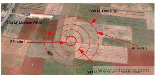 舉例來(lái)說(shuō),評(píng)估一個(gè)包含兩個(gè)RF節(jié)點(diǎn)(節(jié)點(diǎn)1和節(jié)點(diǎn)2)的1km鏈路(范圍)的可行性,其中節(jié)點(diǎn)使用MRF24J40MB模塊,輸出功率為 20dBm。節(jié)點(diǎn)1與增益為1dBi的全向PCB天線相連,節(jié)點(diǎn)2也與增益為1dBi的類(lèi)似PCB天線相連。節(jié)點(diǎn)1的發(fā)射功率為100mW(或 20dBm),靈敏度為-102dBm。節(jié)點(diǎn)2的發(fā)射功率為100mW(或20dBm),靈敏度與節(jié)點(diǎn)1相似。電纜長(zhǎng)度很短,兩端的損耗各為1dB左右。 之后,將所有增益相加并減去節(jié)點(diǎn)1到節(jié)點(diǎn)2鏈路的所有損耗(僅考慮1km鏈路路徑的自由空間損耗)。