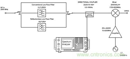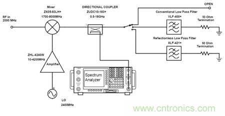 以下將組成測試電路對比傳統(tǒng)濾波器和無反射式濾波器分別配對相同混頻器的性能。
