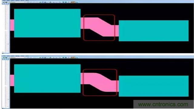 設(shè)計用于射頻和微波的銅皮形狀時,一個很重要的方面是能夠創(chuàng)建帶尖拐角的Gerber 文件。優(yōu)秀的PCB設(shè)計工具可以簡化這一過程。例如,使用50 毫米線條繪制形狀與使用50 毫米圓形光圈繪圖相比,往往令設(shè)計具有較小的半徑。設(shè)計工具在創(chuàng)建Gerber 文件時,可通過正確地自動轉(zhuǎn)換線條寬度來獲得尖拐角(圖2)。